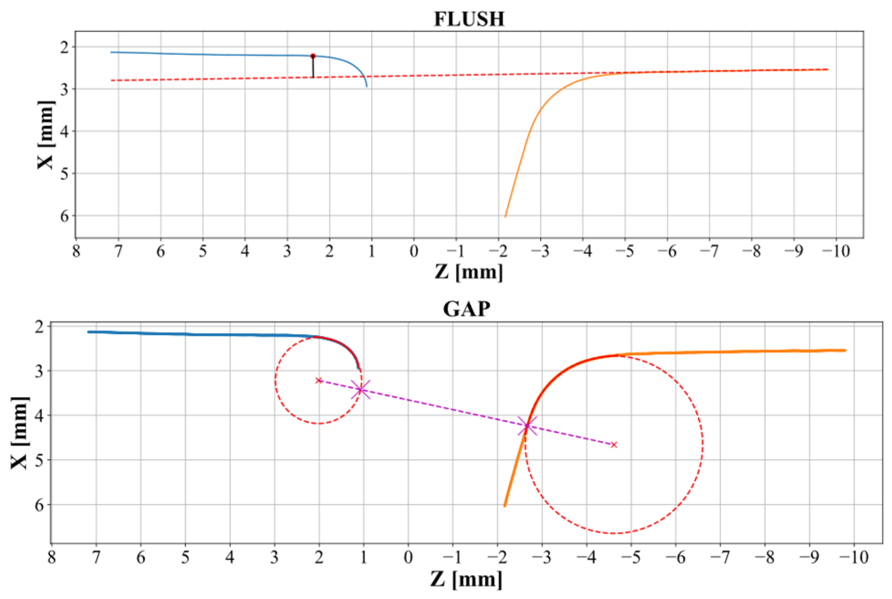 Flush and Gap definitions. The left profile is identified in blue and the right profile in orange. The extracted features are highlighted in red: the circle for the gap and the straight line for the flush. The distance between the two identified gap centers, shown in purple, is included to improve visualization.