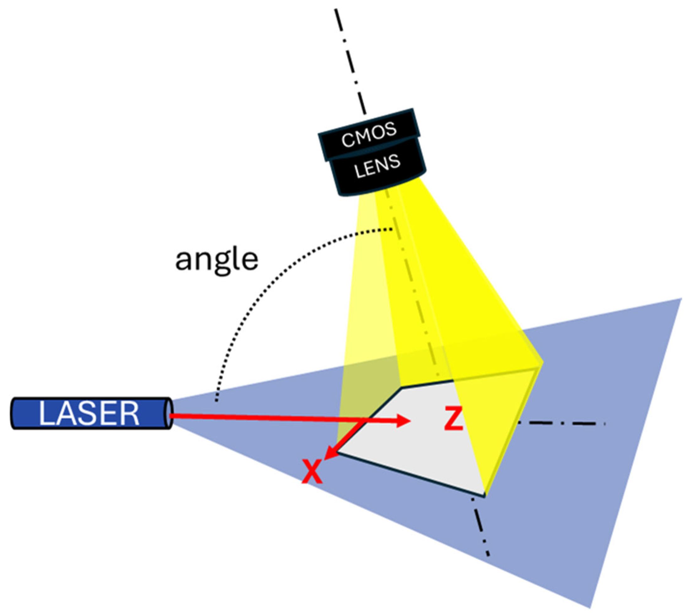 An angle is formed between the optical axis of the camera and that of the laser. The interception of the camera’s FOV with the laser plane defines the sensor’s trapezoidal measurement area [