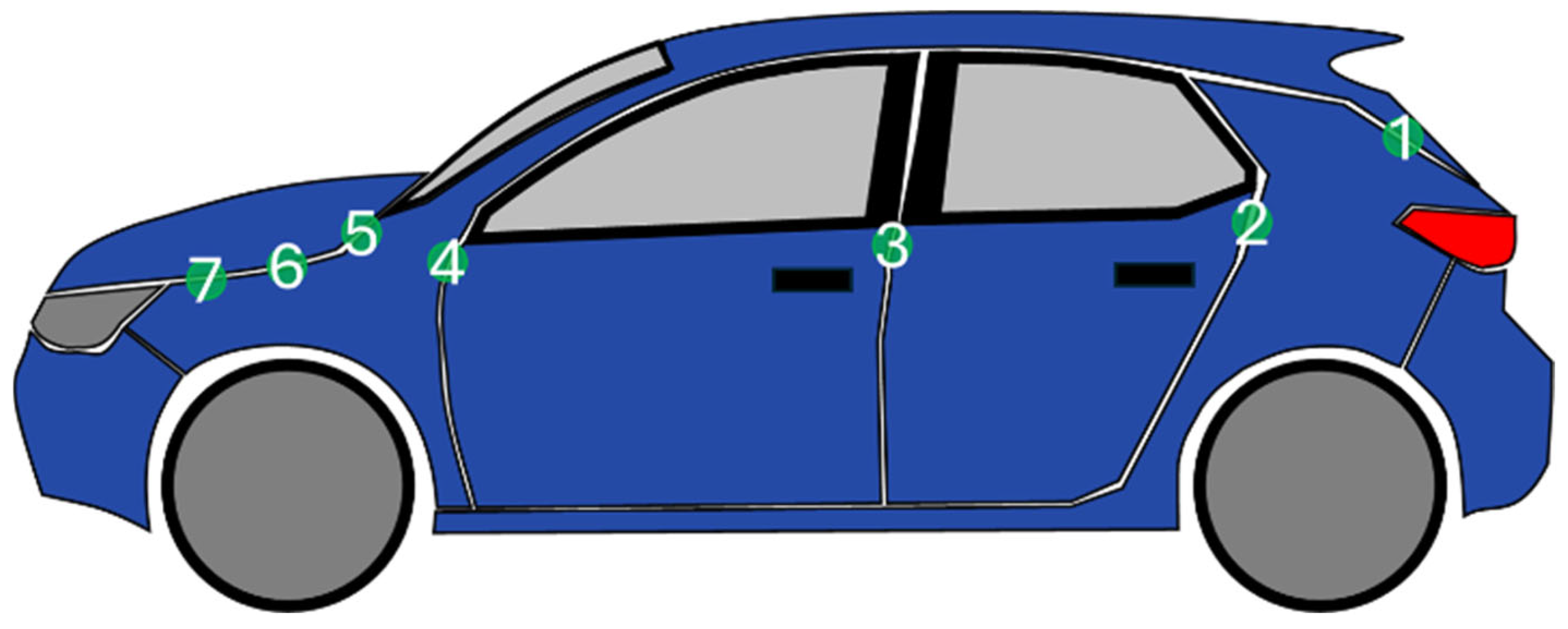 Seven measurement sequence points are shown in green on the car’s left side. On the right side, the same seven points are positioned in corresponding locations.