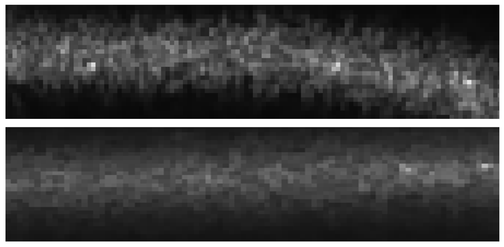Two different images acquired by the sensor zoomed in on the laser stripe. It is possible to see bright points immersed in the laser stripe next to dark points, showing impulsive noise.