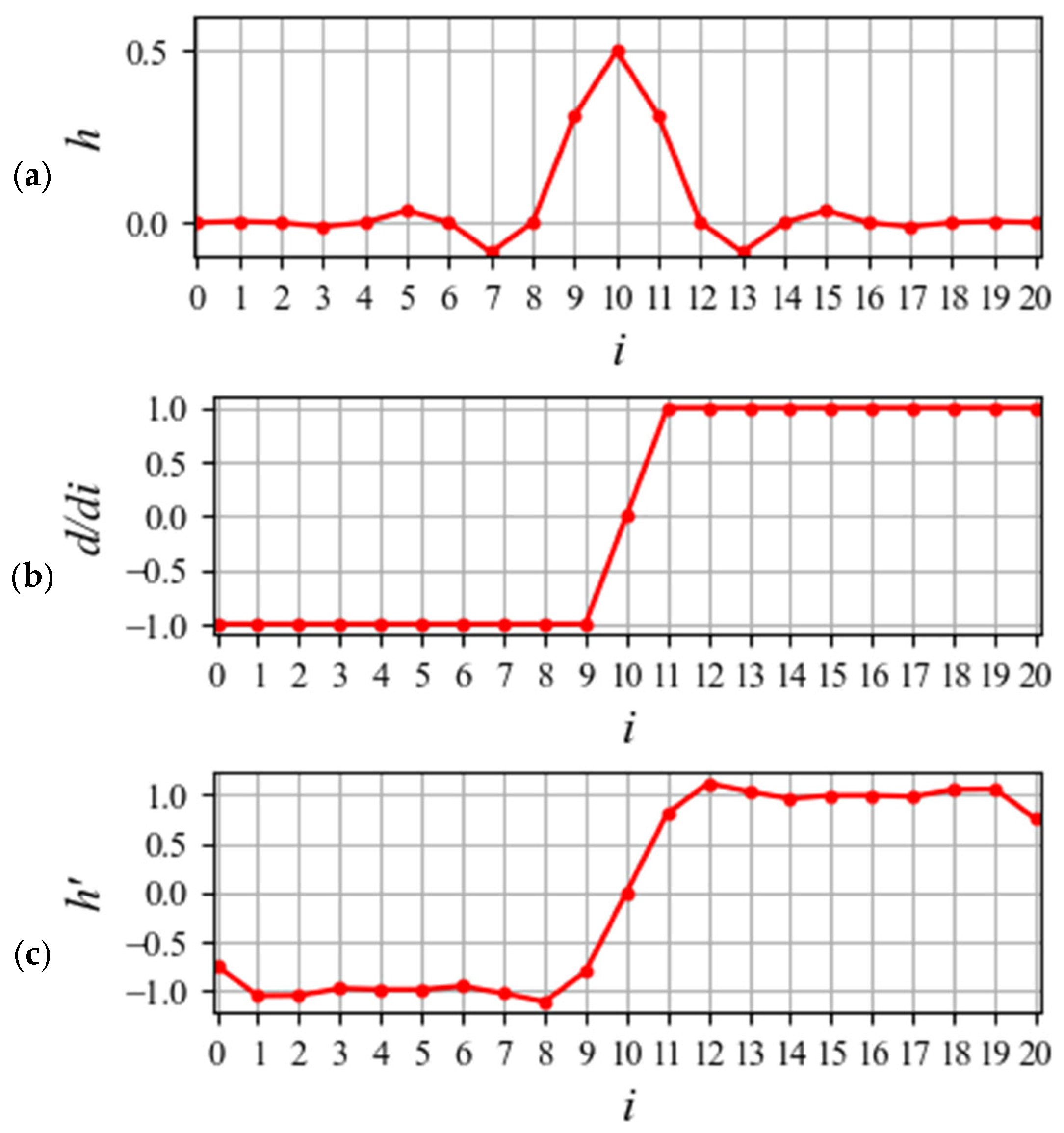 (a) Hamming filter with 21 parameters and cutoff of 0.5. (b) Derivate kernel. (c) FIR filter designed for this paper.