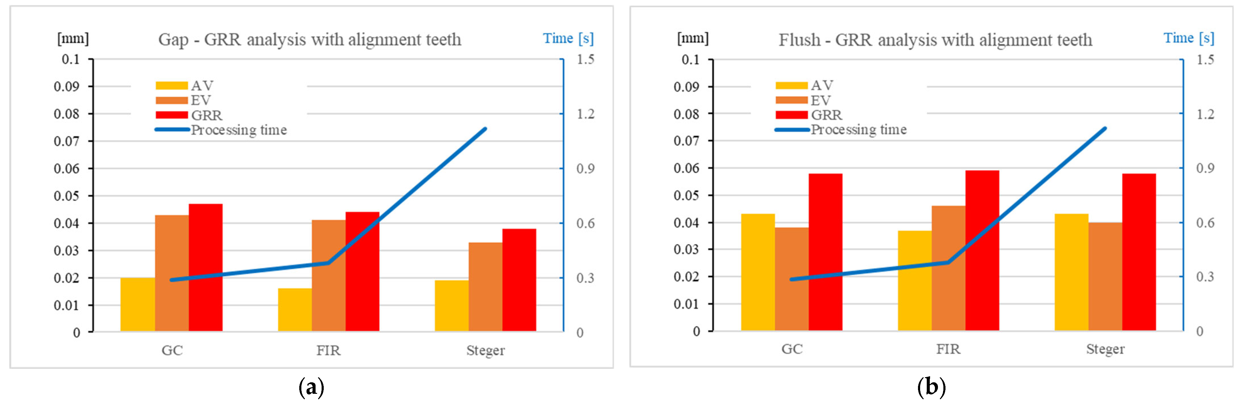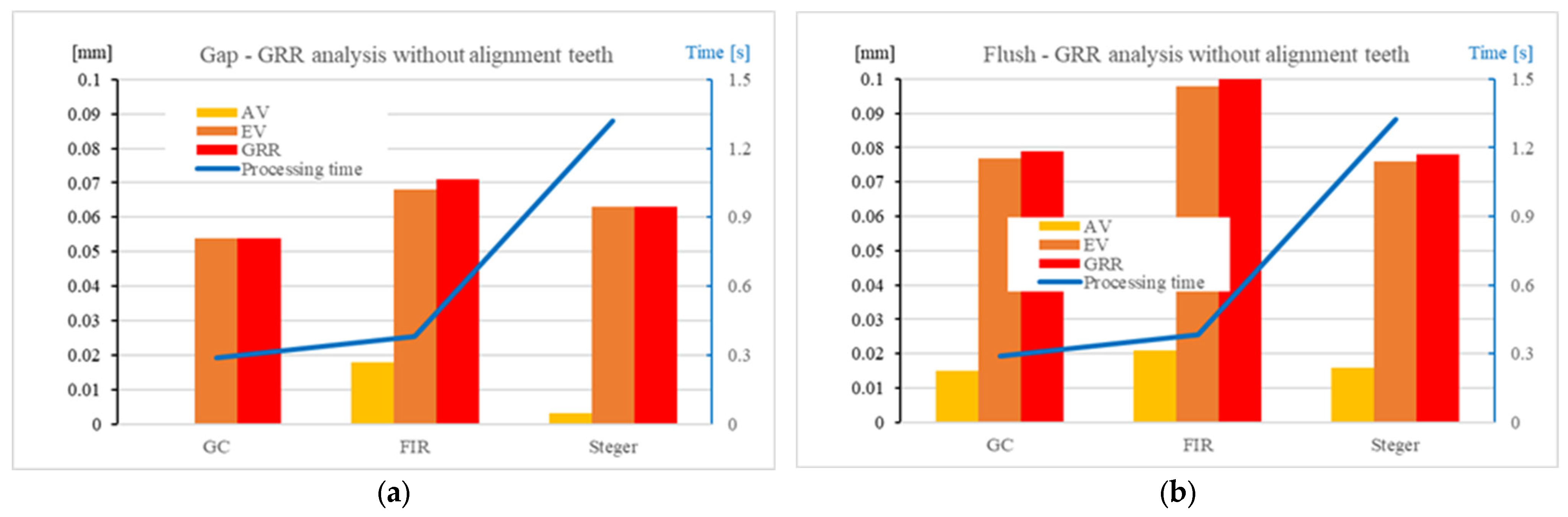 Figure 13 shows the difference in performance, AV, EV, GRR, and processing time between the GC, FIR, and Steger algorithms while the prototyped front panel is used when measuring gap and flush.