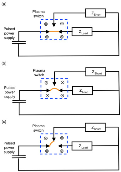 Schematic of switch operation. (a) Laser-induced breakdown of an arc between the supply and load occurs, (b) the external magnetic field increasingly deflects the arc, and (c) the arc begins preferentially conducting a current through the shunt.