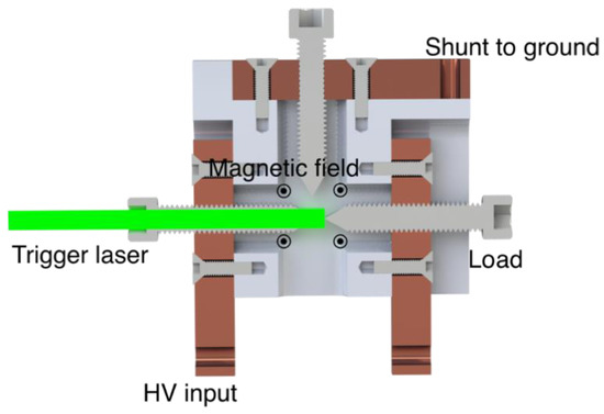 We have demonstrated a new type of plasma opening switch, capable of switching on and off kiloamp currents at kilovolt potentials on microsecond timescales. We envisaged two parallel routes forward. First, our immediate interest in this device is it could be used as a way to reduce the thermal load on a small, high-repetition-rate, dense plasma focus (DPF) [10]. By redirecting the flow of current after the first period, the DPF dynamics—important application metrics, such as neutron and X-ray production—were unaffected, but the thermal load on the device was reduced by up to 90%. Secondly, we also intended to further probe the inner workings of this device by using ultrafast laser and framing camera diagnostics [10]. This will require replacing the neodymium magnets with pulsed coils, as illustrated in Figure 9.