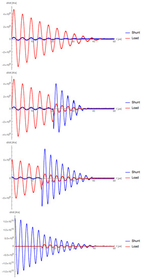 dI/dt traces with shunt-to-centerline distances of 14 mm, 12 mm, 10 mm, and 8 mm, respectively.