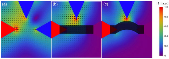 Electric fields in the switch: (a) at the initial state, (b) when preliminary arc strikes, and (c) after arc deflection. Electrode potential is color-coded with red > purple > blue.