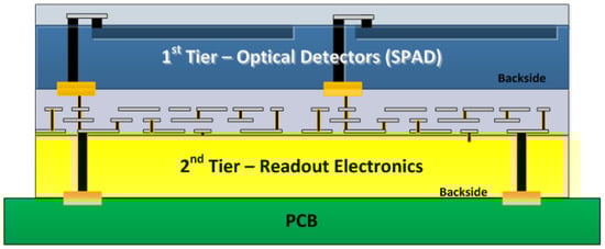 Cross-section of the 3D digital SiPM. The first tier contains SPAD arrays with through silicon vias (TSV) and the second tier contains quenching circuit and time-to-digital converter arrays.