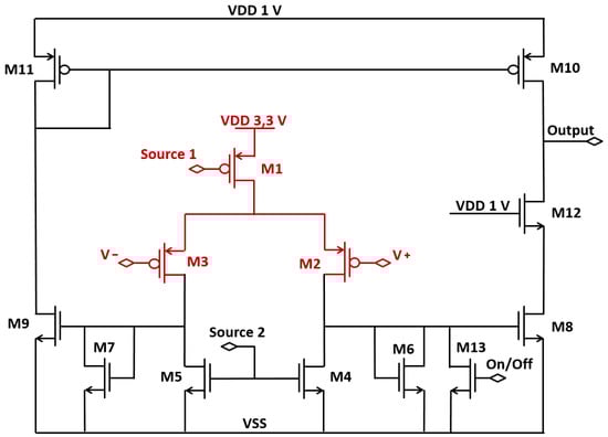 The two-stage operational amplifier used as a discriminator in the quenching circuit. M1–M3 are high voltage transistors (3.3 V) to sustain higher excess voltage and M4–M13 are 1 V transistor to match the subsequent electronics.