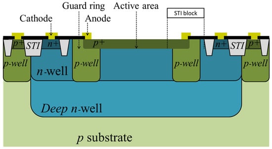 Figure 4 shows a cross section of the 32 sided polygon SPAD made in CMOS 65 nm. The SPAD is a standard implantation (anode) in an n-well (cathode) with a p-well guard ring. A polysilicon layer (gate) was used as blockages for shallow trench isolation (STI) to minimize its effect on the guard ring and on the dark count noise (DCR) []. The SPAD active area is 20 µm. The SPAD has a standard architecture and is expected to have low photodetection efficiency (PDE) and high DCR, but its low capacitance and low area make it suitable for high timing precision measurements.