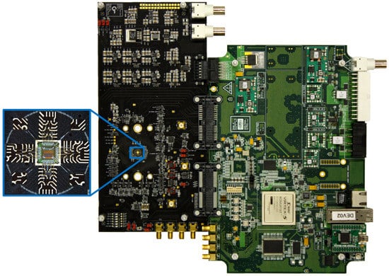 For test purposes, the ASIC is wirebonded on a dedicated daughterboard and powered using a motherboard, both custom designed (Figure 5). The motherboard contains an FGPA with the aim to communicate and configure the ASIC. The daughterboard is designed to fit on an optical test setup, giving the flexibility to connect different ASIC on the same motherboard. The proper supply circuits and event generator circuits used for timing measurements are on the daughterboard.