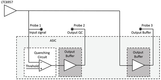 The QC timing jitter measurements use a fast input buffer on the daughterboard designed to minimize the jitter due to the signal rise time. The input signal is buffered using a LTC6957 to minimize the effect of its rise time (400 ps over 1 V) on the timing jitter of the QC. The signals were measured with an Agilent MSO-X 90324A, with 80 GSPS, 13 GHz vertical bandwidth and differential probes. Three different measurements were made using the setup shown in Figure 6. First, the timing jitter of the test setup (input buffer, output buffer and the oscilloscope) was measured using probe 1 and probe 3. Second, the timing jitter of the quenching circuit and the input/output buffer was measured using probe 1 and probe 2. From these two measurements, the quenching circuit contribution can be obtained. The timing jitter is measured with a threshold sweep from 1 mV to 700 mV for 1 V input steps and from 1 mV to 2500 mV for 3.3 V input steps. Third, the time propagation delay of the quenching circuit is measured to determine its variation as a function of overvoltage (0 V to 2 V) and threshold level (100 mV to 1 V) using probe 1 and probe 2.