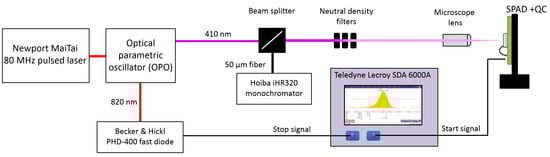 During the SPAD and QC SPTR measurements, the SPAD is illuminated by a Spectra Physics Mai Tai 80 MHz Ti:Sapphire pulsed laser (Figure 7). The pulse width is specified to be <100 s, which means that the laser contribution to the jitter is negligible. The test setup contribution including the laser, reference diode, oscilloscope and probe is measured at 3 ps FWHM. An optical parametric oscillator can tune the wavelength from 345 nm to 2500 nm (410 nm was used for the measurements). The light is attenuated with neutral density filters to ensure the measurements are made in a photon starved environment. The beam intensity is measured using an 818-UV Newport diode and a 1918-R Newport power meter to evaluate the number of photons hitting the SPAD. The laser has been attenuated so that the average number of photons per pulse reaching the SPAD avalanche region is lower than 0.04. The timing jitter measurements are acquired with a Teledyne Lecroy SDA 6000A oscilloscope, with 20 GSPS, 6 GHz vertical bandwidth, an active probe and a Becker and Hickl PHD 400 fast diode as the reference timing detector. The light spot from the laser is defocused using the microscope lens so that the spot has a >5 mm diameter to ensure a good illumination uniformity over all the SPAD active region.The SPTR measurements are performed as a function of QC threshold (1 mV up to 1.6 V) and excess voltage (0.5 V to 1.75 V).