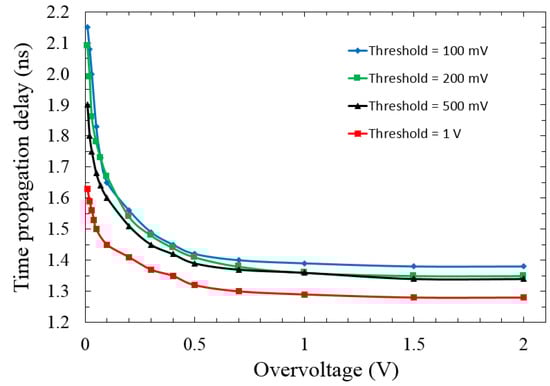 Figure 10 shows the time propagation delay of the quenching circuit as a function of the overvoltage and of the threshold. The overvoltage corresponds to the input applied voltage minus the threshold. The time propagation delay reaches stability above 1 V of overvoltage for a fix threshold. The threshold must be stable in order to minimize its impact on the timing performance. One could define the slope of the flat region as a metric to highlight the timing impact of the time propagation delay. In the present case, the value is ~3 ps/100 mV for the overvoltage.