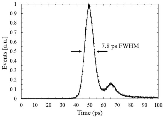 Figure 11 shows the SPTR of the 20 µm SPAD and the QC. The measured timing jitter is 7.8 ps FWHM. This includes the test setup contribution measured at 3 ps FWHM (oscilloscope and probe). Hence, the corrected SPTR of the SPAD and QC is = ~7 ps FWHM considering that the contributions are not correlated. The second peak at 65 ps is a reflection in the optical setup.
