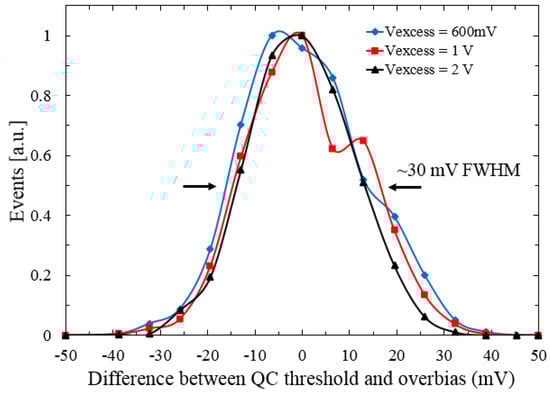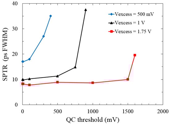 Figure 12 presents the effect of the QC threshold on the timing jitter of the detector for multiple excess voltages applied to the SPAD. The timing jitter is better at high excess voltage. Using low threshold minimizes the jitter, especially at low excess voltage.