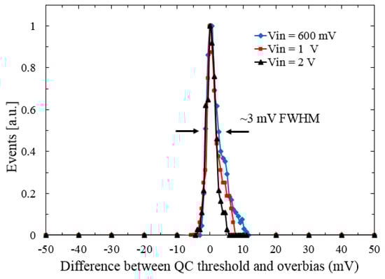 This work also aims to better understand the different contribution to the SPTR from the combination of the SPAD and the QC. The measured SPTR of the QC with an integrated SPAD is 7.8 ps FWHM (Figure 11). The jitter measurement with a step signal demonstrated that the QC jitter is extremely low, i.e., similar to test setup jitter of 4 ps FWHM (Figure 8). This timing jitter study provides an important insight about the single SPAD SPTR: the combination of the SPAD excess voltage variation and the time propagation delay variation must be low enough to be a negligible contribution to the SPAD SPTR. In the case of the QC developed, it does not limit the SPTR for a SPAD with an excess voltage variation of 30 mV FWHM or lower if sufficient excess voltage is applied (Figure 17). Consequently, the main contribution of the 7.8 ps must come from the SPAD itself (avalanche multiplication statistics) or from the QC input signal shape (e.g., parasitic capacitance) that affects the QC timing jitter. Considering that a proper design can be achieved on the SPAD layer, the 3D process connecting the SPAD to the QC is critical since the SPTR could be limited by the parasitic capacitance at the QC input node. Further studies with varying capacitance at the input of the QC could help determine the main contribution between the two aforementioned.