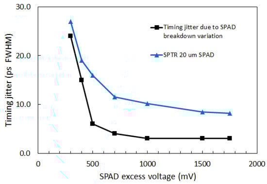 The SPTR is the timing jitter of the whole detector, including its readout electronic, when triggered by a single photon. While applications such as rangefinders minimize this jitter by averaging multiple measurements, ToF-PET and time imaging calorimeter require optimized SPTR for single event time arrival detection. Furthermore, in low-light detection applications such as Cherenkov radiators or Cherenkov PET detectors [,,], the SPTR is critical since very few photons are emitted, hence detected.