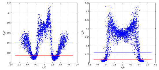The possibility of different statistical properties of each hit is based on well known properties of the MIP hitting a silicon strip (or gas discharge) detectors, largely reported in literature: (a) the charge released in each hit has a Landau distribution with different signal-to-noise ratio. (b) The position resolution depends from the charge spreading thus it is better near to the strip border (e.g., ref. [19] for gas ionization chambers) (c) Each strip has its own noise. Thus, the assumption of homoscedasticity (on an entire detector layer) is inconsistent for the previous well known reasons, which are common to a large class of detectors. Even if the hit properties (a)–(c) are well known, no attempt was done to insert them in a fit for the mathematical difficulties of this task. For the first time, we developed a set of analytical tools to insert these random effects in track reconstruction. The complex mathematical infrastructure, we realized, is able to generate appropriate PDF for each hit, hundreds of thousands of different PDFs. A few results of this mathematical infrastructure, illustrated in the follow, are reported in Figure 1. They are samples of the (calculated) effective variances [9] for hits in the two sides of our micro-strip detectors. Small effective variances at the strip borders can be observed in the right part of Figure 1 for the noisy normal strip side. They share some similarity with the results of ref. [19] supporting a general aspect of this border effect. The floating strip side is almost always much better, the vertical scale of the right plot is around three times that of the left plot. Even this side shows a border effect similar to the other side, here the physical border of the readout strip is at .