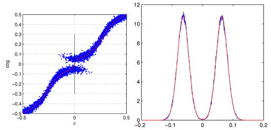 An example of Equation (5) can be seen in the right side of Figure 2. The essential elements are the two maxima (gaussian-like) centered in the possible noiseless two-strip COG: and . The widths of the two maxima are modulated by the signal-to-noise ratio and , the factor is relevant at the borders of the x-range, i.e., . Each maximum has a scaling factor or that, for the large majority of strip clusters , is the signal to noise ratio of the central strip.