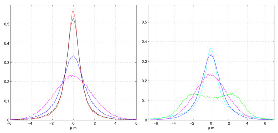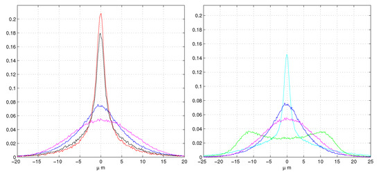 Increasing the impact position , the lowest maximum tends to disappear. Similarly at decreasing , the highest maximum is rapidly reduced. The tails of the maxima differ drastically from gaussian PDF. More complete expressions of Equation (5) contain terms very similar to Cauchy PDFs, they have no factors and survive when all the are zero.