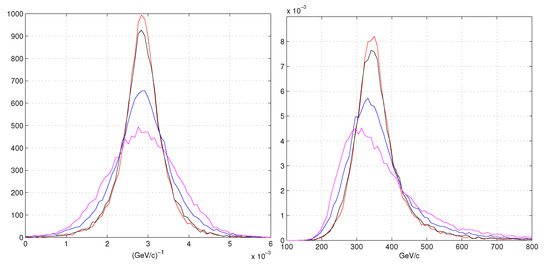 The large variations of the effective variances observed in Figure 1 have effects even in the standard least squares method. The heteroscedasticity couples the track variance to the parameter distributions. Tracks, richer of good or excellent hits (as we defined above), have an higher probability to have lower residual variance. Obviously if the hit reconstruction is free from systematic errors. The -algorithm has this property. Hence, a track selection with the lowest values of the track residual variance (called in ref. [22] ) has the distribution of the reconstructed momenta overlapping our best PDFs of Figure 4 and Figure 5. The price is an efficiency below but these improvements can be obtained without any modifications of the fitting methods. For the COG hit positions, the selection has no “gift” from heteroscedasticity. The COG positioning is dominated by its systematic error that destroys any correlation with good hits.