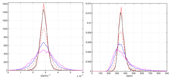 Left plot. Distributions of the curvature in (the parameters) for the high noise detector for a selection of two excellent hits. The two highest distributions are the MLE and schematic model. The two lowest distributions and the dashed one are those of Figure 3. To the right the momentum distributions.