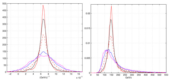 (Left plot) distributions of the curvature in (the parameters) MLE (red), schematic model (black), hit position (blue), hit position COG (magenta). (Right plot) reconstructed momentum distributions. Color code as in the left plot.