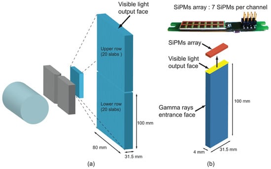 Design of the knife-edge slit camera. (a) The device consists of a tungsten collimator (grey) and a photon detector based on scintillation crystals and read out by silicon photomultipliers. 40 crystals are arranged in two rows, each with 20 slabs. (b) More detailed view on the readout of the scintillation crystal. With permission from [8].