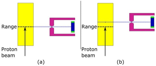 Setups for the MC simulations. The proton beam impinges on the water phantom (yellow) and the prompt gammas are detected through the tungsten collimator (pink) by the photodetector (blue). (a) The setup used for the simulation of the normal profile, that is, with the central imaging plane of the camera (i.e., pair 10/11, resembled by the blue dotted line) aligned with the proton range (black dashed line). (b) One of the individual steps of the simulation of the reconstructed profile. The central pair is placed in the position of pair 19/20 with respect to the nominal case shown in (a). The simulation was developed by Smeets et al. [7].