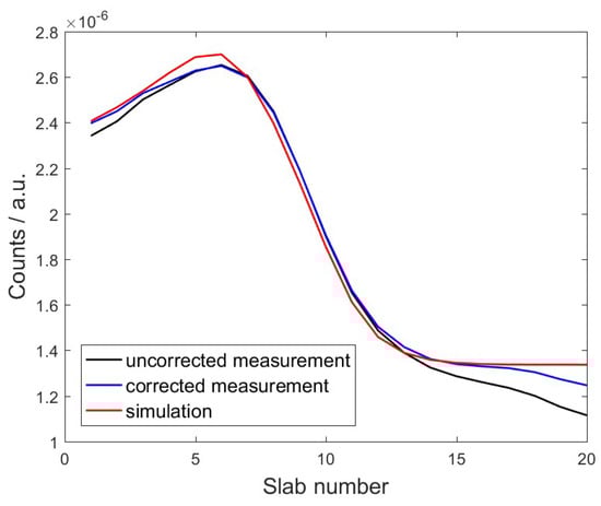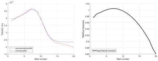 The geometrical correction should improve the agreement between measured PG profile and simulated one by correcting for differences due to simplifications in the analytical transfer functions. Here, the correction is used to adapt the measurement as it allows for an easier range retrieval when shifting both profiles against each other to determine the shift. To obtain the geometrical correction, the actual response of the camera including edge effects has to be compared to the idealized and more homogeneous response that is considered in the transfer function of the analytical model. The two cases are simulated as follows: first, the central imaging plane (slab pair 10/11) is aligned with the Bragg peak (Figure 2-left) creating the normal PG profile (red curve in Figure 3-left for an exemplary case). In the second case the central imaging plane (pair 10/11) is shifted along the beam axis to be in the position of 10 slab pairs (1/2, 3/4, …, 19/20) of the first case, which is exemplarily shown in Figure 2-right for pair 19/20. With this procedure, an artificial prompt gamma profile (blue curve in Figure 3-left) can be reconstructed, which shows for each slab pair the same response as the central pair. We can clearly identify the deviations between both profiles especially for slab numbers 15 to 20. By determining the relative function between normal and reconstructed profile, one obtains the relative response of each slab with respect to the homogeneous response, that is, by definition the geometrical correction (see Figure 3 right).