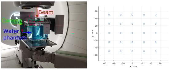The geometrical correction model has to be validated on measured data. For the validation, the measurement and setup uncertainties have to be as small as possible. Therefore, a dedicated benchmark experiment is designed and conducted at University Proton Therapy Centre in Dresden (Germany). The proton therapy centre comprises a Cyclone C230 cyclotron from Ion Beam Applications (IBA) and is equipped with PBS. The proton beam is delivered on a water phantom (Digiphant from IBA dosimetry, see Figure 4 left) from the top to not cross any other material than water. The camera and the water phantom are positioned using the laser system of the treatment room. The position of the water phantom is verified using fiducial markers and the X-ray system resulting in a positioning uncertainty of about 0.2 mm.