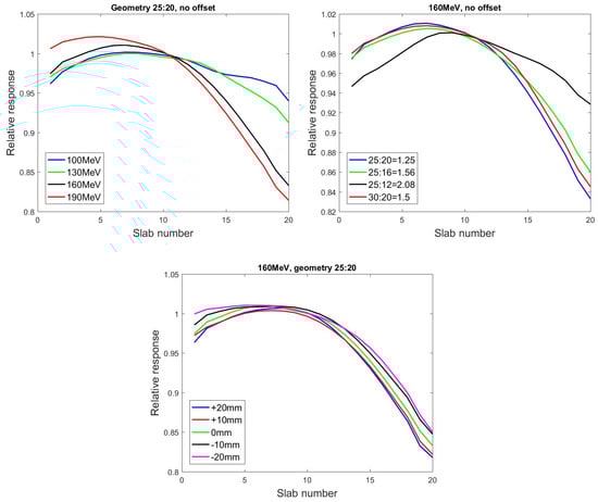 The geometrical correction is shown in Figure 5 top-left for different beam energies for a fixed geometry of 25:20 and no offset. A clear dependency of the correction function can be seen when varying the beam energy. The geometrical correction function is flatter and relatively symmetric for 100 and 130 MeV while we see a strong asymmetric behaviour for 160 and 190 MeV. We can therefore conclude that the beam energy is an important parameter in the simulation study.