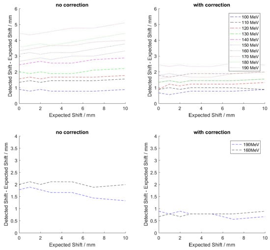 The shift between measured and simulated profiles is determined using Reggui. To analyse if the range retrieval improves when applying the geometrical correction, both cases (with and without correction) are compared. The results for the analysis of the central spots of the aligned layer (i.e., the camera is looking at a specific iso-energy layer) are shown in Figure 7 for different beam energies and camera setups. This resembles the simplest case which helps to better understand potential deviations. The data point with an expected shift of zero resembles the actual measurement, while the other points with higher expected shift are artificially changed in the simulation. In case of perfect agreement, the parameter “detected shift minus expected shift” should be a straight line with a value of zero. For the data analysed without geometrical correction (see Figure 7 left), it is obvious though that the values are different from zero and that a high spread occurs especially for the 25:20 geometry as function of the beam energies. While 100 MeV has about 1 mm shift offset, it is around 4.5–5 mm for 190 MeV. Also, we can see that the response is not flat but increases slightly with the introduced range shift. This is in contrast to the expected flat response. The deviations become smaller for the larger FoV with 25:12. When applying the geometrical correction (see Figure 7 right), the curves are closer to each other as the absolute spread reduces from around 4 to 2 mm. Furthermore, the intrinsic offset is a bit lower and the response for introduced range shifts is flat as expected. For 25:12, we cannot even identify a significant difference between the curves for 160 and 190 MeV meaning an improved robustness compared to the analysis without geometrical correction.