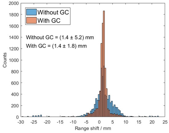 Histogram displaying the range shift between simulation and measurement for all delivered spots for the 25:20 geometry. Blue shows the results without applied geometrical correction while the orange bars include the geometrical correction.