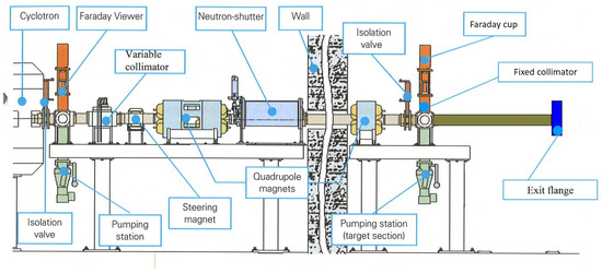 The 18 MeV proton beam, produced by the cyclotron, proceeds horizontally to the experimental room via the beam transport system, consisting of a variable graphite slit, an XY magnetic steerer, a quadrupole doublet and a quadrupole singlet. A two meter thick concrete wall, through which a stainless steel vacuum pipe transports the beam, separates the cyclotron bunker from the experimental room, where the beam is finally extracted in air. This section of the beam line can be isolated by means of a pneumatic valve and contains the following elements: a circular water-cooled Aluminium fixed collimator of 15 mm diameter, a pumping station and a retractable graphite Faraday cup for the measurement of current, covered with a phosphor scintillator (ZnS–Ag) to observe the beam shape and size by means of a video camera. Mounted on the exit flange, there is a 15 mm diameter graphite collimator, separated by one meter from the fixed collimator, to which a thin Mylar window is attached. A schematic representation of the beam line is shown in Figure 1.