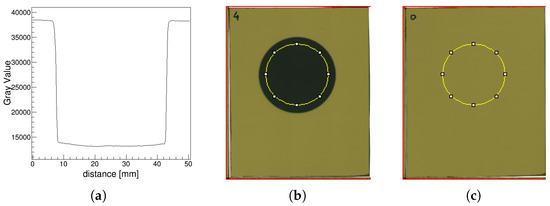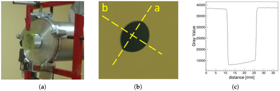 (a) EBT3 film mounted for the measurement of beam shape directly after the exit window; (b) EBT3 film showing beam shape; (c) profile of the beam taken along the “a” axis: the colour value of each pixel is plotted versus its position along the profile chosen. The lateral dimension of the beam at FWHM (Full Width at Half Maximum) is approximately equal to 15 mm, which corresponds to the dimension of the graphite collimator.