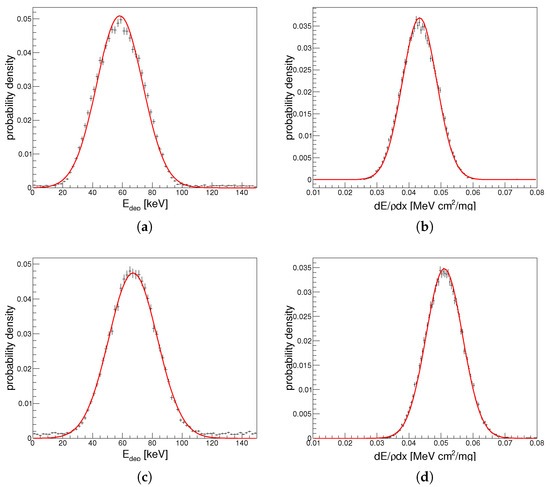(a) distribution of energy deposited per individual proton track () in the ionization chamber and (b) track-averaged spectrum of in the active layer of the film for the 10.7 MeV proton beam; (c,d) are the same to (a,b) for the 8.8 MeV proton beam. The red curves are the Gaussian fits of the simulation results (black markers). Mean values and uncertainties of the Gaussian fits are reported in Table 2. The referred proton beams were obtained after degradation in air and tungsten foils (see main text for details).