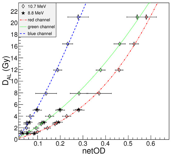 The calibration curves for the three colour channels, plotting the dose against netOD, are shown in Figure 6. These curves have been fitted according to Equation (4), as suggested in literature [24],