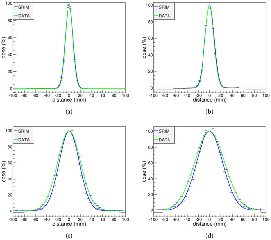 Lateral dose profiles measured (green) and simulated (blue) at different irradiation conditions; the energy value stands for the mean energy at the active volume of the EBT3 film. (a) 15.6 MeV: mm and mm. (b) 15.1 MeV: mm and mm. (c) 14.2 MeV: mm and mm. (d) 13.7 MeV: mm and mm.