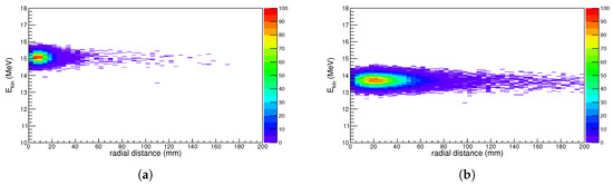 Example of simulated kinetic energy profile off-axis as a function of the radial distance, integrated over all directions contained in the scoring plane. The kinetic energy of the protons impinging on the active layer of the film is plotted against the distance of their interaction point from the beam axis in the transverse plane. Both plots represented here have been obtained for a distance between the exit window and the film of 63 cm, without (a) and with (b) a 50 m tungsten scattering foil.