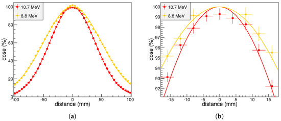 (a) comparison of full dose profiles obtained with a 150 m thick tungsten foil (red squares), corresponding to a mean energy of 10.7 MeV at the film active volume, and with a 200 m thick foil (yellow dots), corresponding to a mean energy of 8.8 MeV; (b) zoom of the same profiles in the region where samples are meant to be placed, after the PMMA circular collimator of 35 mm diameter. Deviations from the maximum dose of 8% and 5% are observed for the 10.7 MeV and 8.8 MeV incident beams, respectively.