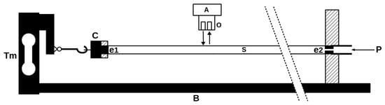 The test bench scheme: B, rigid basement; Tm, tensometer; e1, closed end plug; e2, end plug with a gas supply channel; C, end cap with a seal; P, pressure supply; S, straw; O, optical coupler; A, amplifier.