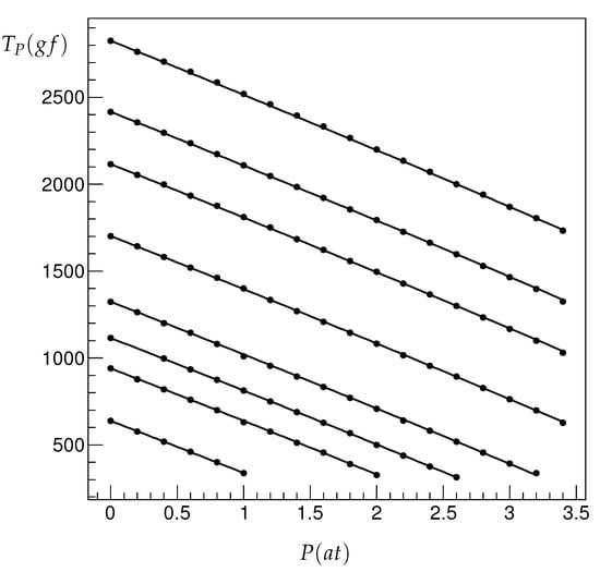 The radius correction (Equation (A12)) was considered, but its effect was also completely included in the systematic errors as a “radius correction” contribution. The Gaussian width of the NA62 straw diameter distribution was approximately 0.03 mm, and the systematic shift of its central value from the nominal number was the same size [9]. Thus, considering a conservative value of the radius systematic uncertainty of 0.05 mm for the tested specimens, we obtained the “radius value” contribution to the systematic error shown in Table 2. Moreover, the effects of scale change by the factor of 1.05 for both the measured effective tension and measured overpressure P were considered as independent contributions (“ scale” and “P scale”) to the systematic errors.