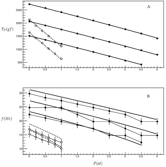 The results of the lowest frequency measurements are shown in Figure 3B along with the corresponding calculation results based on Equation (A11). The error bars show the frequency uncertainty of 1 Hz defined by the width of the observed spectrum peaks.