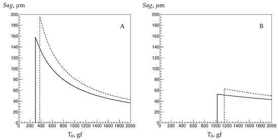 Sagitta in vacuum versus pre-tension of 70-cm-long straw segment for: 9.8-mm straw (A); and 18-mm straw (B). Vertical lines mark the buckling limit . Solid line is calculated for the central values for all parameters. Dashed lines show the worst case (see text).