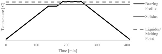 The temperature profiles adopted for all brazing trials in this study featured two dwell points at which the temperature was held constant. The generic form of the profile was developed through numerous experiments, as well as a review of relevant literature and industry best practices, and is shown in Figure 2 [14,21]. The first dwell occurs between 30 and 50 °C below the solidus or melting temperature of the braze material and lasts approximately 30 min. This allows all components to reach similar temperatures before brazing takes place. Following this dwell, the temperature is increased to approximately 10 to 30 °C above the melting or liquidus point of the braze material. This dwell lasts approximately 60 min, during which the braze material flows and wets all neighboring components. Following the second dwell, the sample was allowed to cool at a controlled rate.