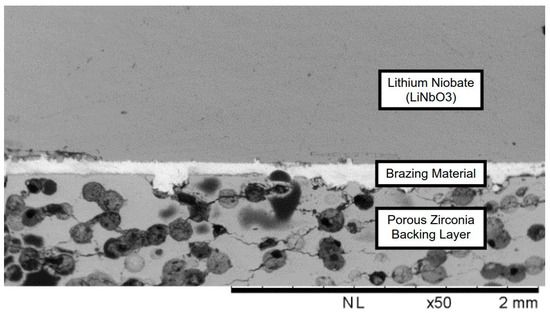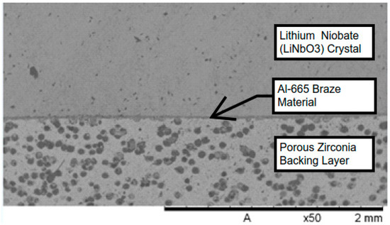 In order to assess the quality of the brazed bond to lithium niobate, both mechanical and ultrasound assessments are required. It was therefore necessary to bond the piezoelectric element to a neighboring transducer backing component. In addition, to reduce thermally induced interfacial stress on the piezoelectric crystal, it is ideal to select a backing material whose coefficient of thermal expansion (CTE) is similar to that of the crystal. Porous zirconia was selected to serve as a mechanical damper to broaden the transducer bandwidth [7]. Zirconia is an oxide-containing ceramic material with several material characteristics in common with lithium niobate, including CTE, such that it is a suitable mate for brazing trials with LiNbO3 [11].