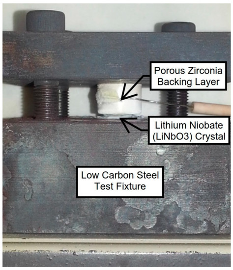 For room-temperature acoustic performance evaluation, each piezoelectric element was coupled to a low carbon steel block approximately 36 mm thick using conventional ultrasound gel. A coupling pressure of approximately 250 MPa was selected based on a study of coupling pressure versus SNR of a LiNbO3 crystal brazed with AgCu to porous zirconia, and fasteners were used to apply this clamping pressure. Figure 4 shows a transducer assembly, including both piezoelectric element and porous zirconia backing layer, coupled to the steel piece.