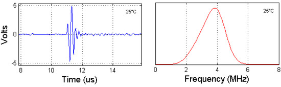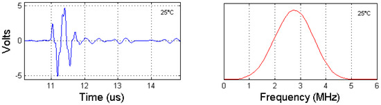 Time and frequency domain signal from backwall echo of steel test block for LiNbO3 brazed with Al-665 (room temperature test).
