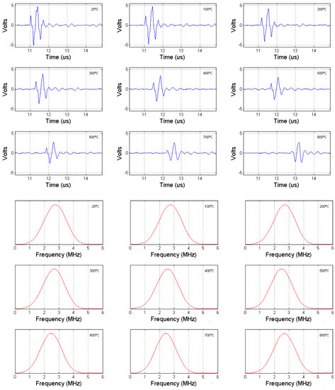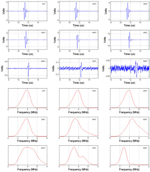 As a primary motivation for identifying suitable bonding systems for lithium niobate is its high temperature performance, transducer stacks made with the two successful braze materials were also evaluated at elevated temperatures. The lithium niobate crystal in each assembly was dry coupled directly to the steel test fixture shown in Figure 5 in a similar method to that previously described. The fixture was then heated in an oven with atmospheric air at a rate of 4 °C/min to a maximum temperature of 800 °C (approximately 400 °C below the lithium niobate Curie point) in stepped increments of 100 °C. An ultrasonic backwall echo was captured at each step in the heating program. The high-temperature performance of lithium niobate assemblies brazed with Al-665 and AgCu can be seen in the time and frequency domain backwall echo signals included in Figure 8 and Figure 9. It should be noted that an increase in the delay of arrival time of the backwall echoes is apparent with increasing temperature with both the Al-665 and AgCu-brazed samples. It is hypothesized that this is due both to the thermal expansion of the test-piece, as well as the decrease in ultrasound velocity in steel with increasing temperature [22].